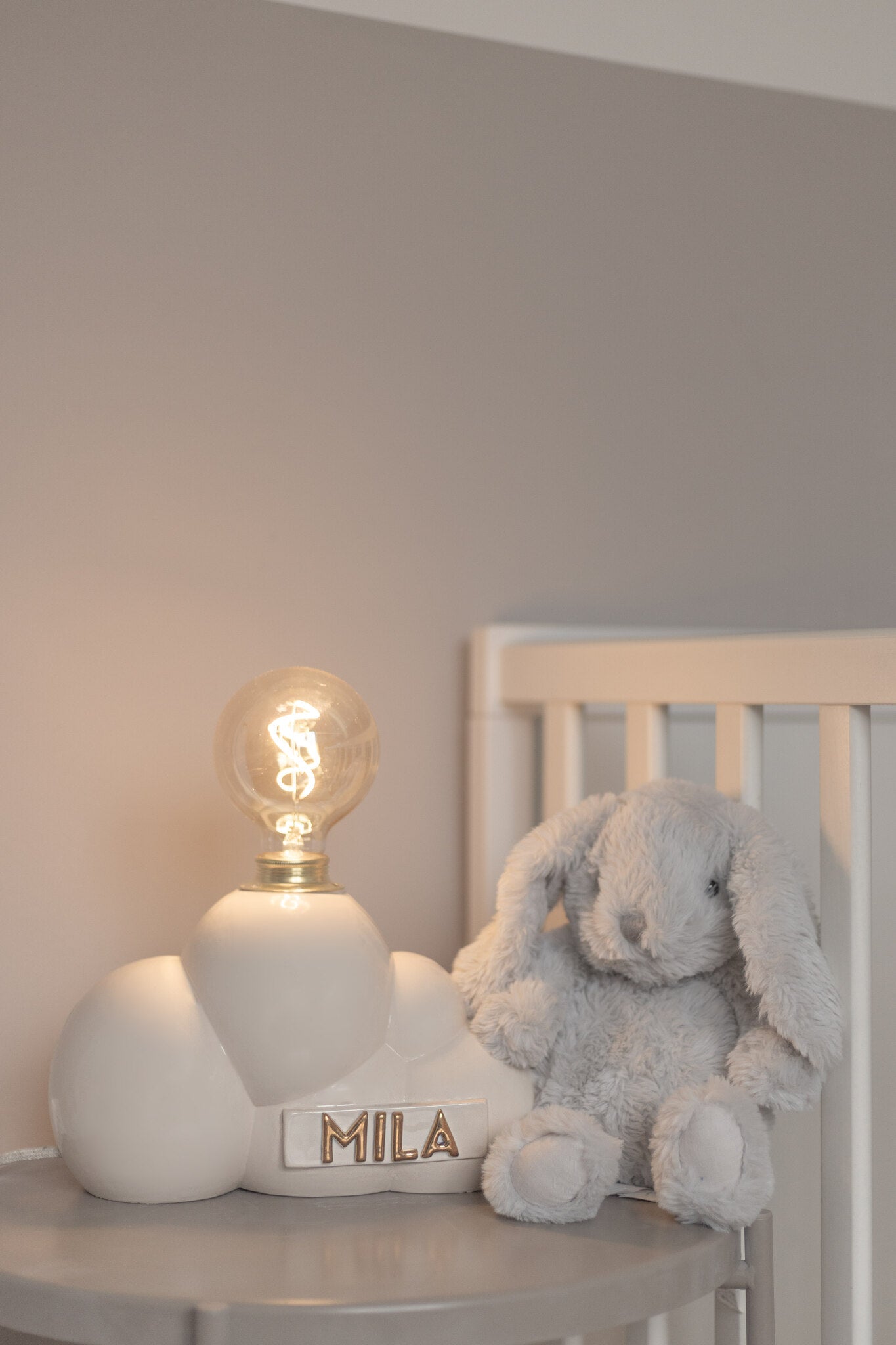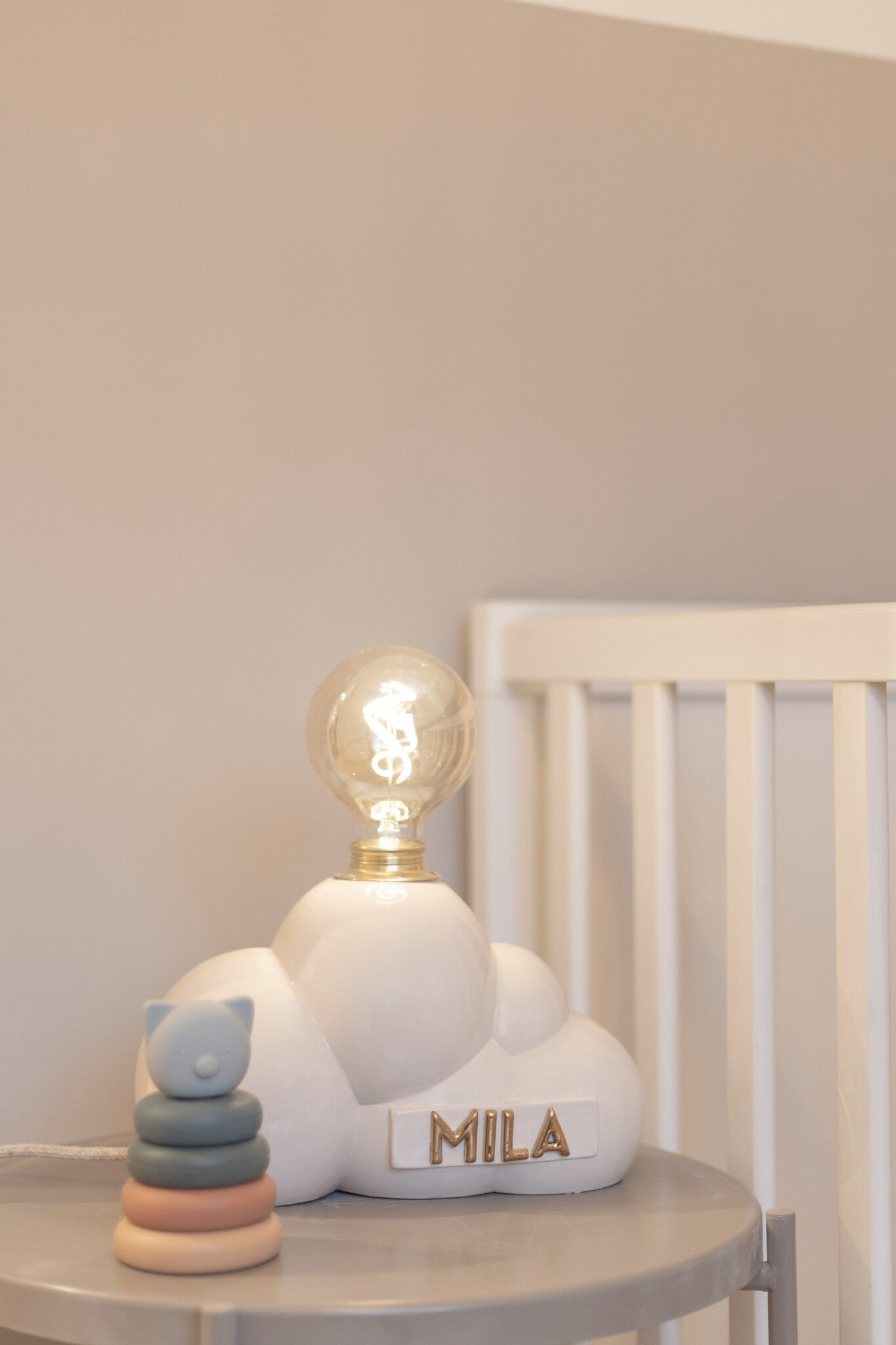 Nježno, ručno izrađeno svjetlo koje večeri pretvara u miran ritual. Personalizirana imenom djeteta, stvorena je da donese osjećaj sigurnosti, topline i tišine u dječju sobu — tamo gdje počinju najslađi snovi.